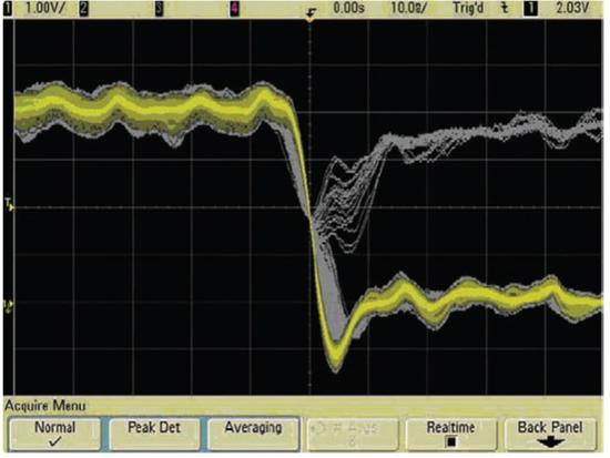模拟示波器非常实用,因为荧光点会继续发光一段时间而不会马上消失。您可以在几个彼此重叠的示波器迹线上看到信号的毛刺或不规则性。由于当电子束击中屏幕时便会显示波形,所以显示信号的亮度与实际信号的亮度有关。这使显示屏与三维显示屏类似(换句话说,x 轴代表时间,y 轴代表电压,而 z 轴则代表亮度)。