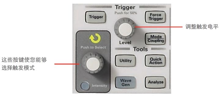 图 20. Keysight InfiniiVision 2000 X 系列示波器前面板上的触发控制区域