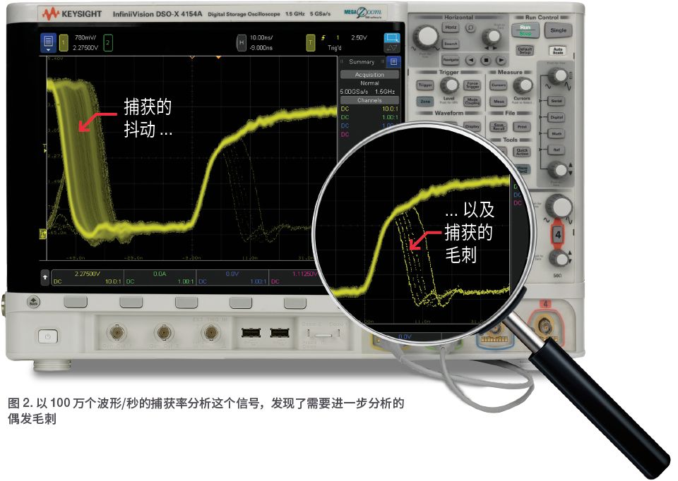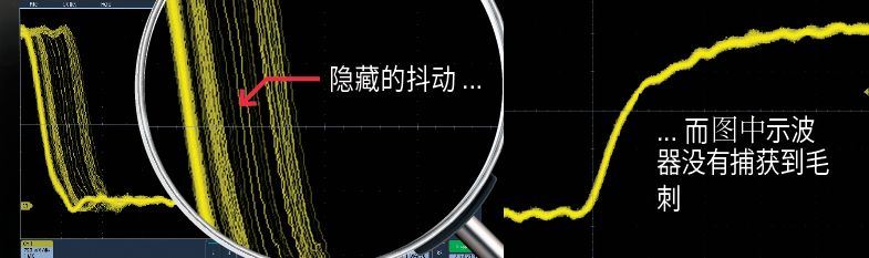 除了捕获毛刺外,波形捕获率越高还意味着示波器的响应速度越快。它能够显示微小的波形细节,而其他方式无法做到这一点。这些细节能够说明存在噪声和抖动,可能需要进一步分析。在图 3 中,您可以看到图中示波器遗漏了某个抖动,但是 Keysight 3000T 示波器准确捕获了它(图 2)。