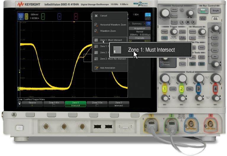 如果波形捕获率足够快,捕获到了罕见事件,那么下一步就是将它们隔离。由于需要采取多个步骤进行处理、计算和猜测,因此隔离这些罕见的事件可能有一点麻烦。使用 Keysight InfiniiVision X 系列示波器的话,您只需在示波器屏幕上用手指划出一个区域即可隔离信号事件。然后,您需要选择是否让信号与这个区域相交。通过这种方式,您可以设置在罕见或复杂的事件上触发。