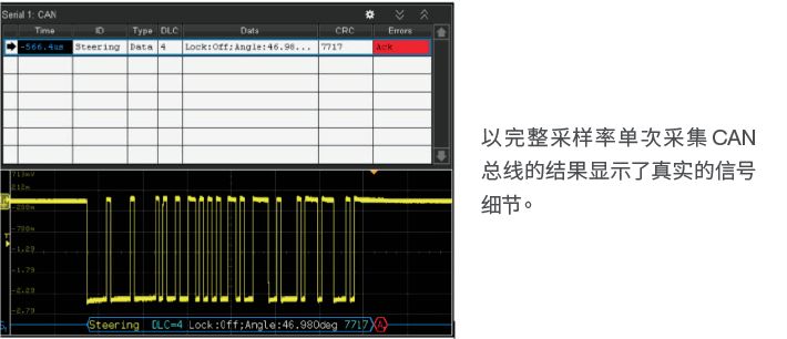 图 8. 为在高采样率下捕获的每个错误数据包中的信号细节。在使用分段存储器进行串行总线解码时,您会得到一个列表视图,其中包含详细的解码信息和每个数据包的时间戳。您可以轻松点击每一行来分析数据包并进行测量。而基础示波器不支持分段存储器采集