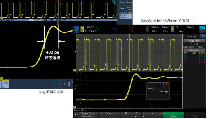 如果您在普通示波器和 Keysight InfiniiVision X 系列示波器上都设置了这种类型的触发,是德科技示波器会将触发点精确放置在指定的触发参考位置。普通示波器系列则会将触发点放置在指定触发点之前400 ps 处。在这个示例中,它将触发点放置到边缘后的纹波上,而不是放置在上升边缘上。