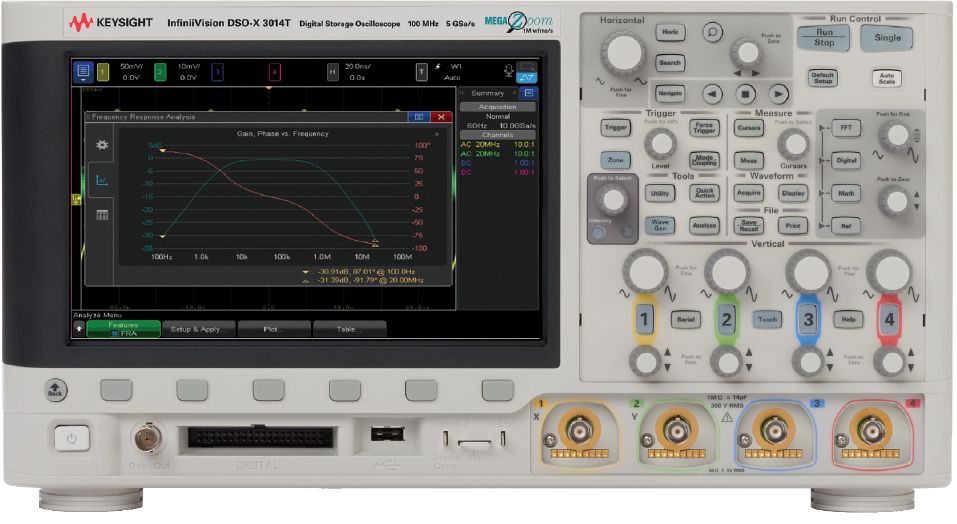 Keysight InfiniiVision 3000T X 系列示波器提供 100 MHz 到 1 GHz 的带宽选择。Keysight InfiniiVision 4000 X 系列示波器也属于同一档次,它提供 200 MHz 到 1.5 GHz 的带宽选择。这两个系列的示波器都配有一个 8 位模数转换器 (ADC),并提供两个或四个模拟通道,另外还可选配 16 个数字通道用于分析数字数据。