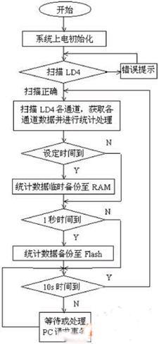 本文设计的控制板系统原理框图如图2所示,以LPC2114为核心控制单元,该芯片是一种支持实时仿真和跟踪的16/32位基于arm7TDMI-S内核的CPU。内部集成了4路10位A/D转换器,两个32位定时器、一个实时时钟和看门狗,多个串行接口,包括两个工业标准的UART、高速和两个SPI总线接口,外部多达46个与TTL电平兼容的通用I/O口,非常适用于作为主控单元。CPLD EPM7128作为微处理器的扩展输入/输出,通过光电耦合和LD4标准定义总线相连,该标准定义的总线基于RS-485总线通信协议。LD4和控制板通过标准总线进行数据交换,控制板每隔10秒扫描并发送一次请求数据的命令,相应LD4通道返回请求数据或者无效信息,arm处理器对获得的各通道数据进行相应的统计运算处理。每隔用户设定的间隔时间就将统计数据存储于静态RAM,供中心站定时获取,同时,以分钟为单位将统计的数据备份至Flash电子硬盘中。中心站可以通过请求备份数据命令获取相应时间段的数据,并存入数据库。中心站和控制板采用RS-232串口方式通信,利用调制解调器实现远程数据传输。为了解决大容量存储问题,系统使用了三星公司提供的K9F2808来作为电子硬盘,16MB的容量能够存储11天备份数据,并且该电子硬盘能够灵活升级。