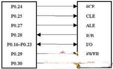 LPC2114和Flash电子硬盘之间的连线如示意图,由于LPC2114没有外部总线,所以对Flash操作只能采用I/O操作方式。K9F2808各种操作具有共同特点,即在I/O端口首先发送操作命令字到命令寄存器,其后的连续3个周期发送需要操作单元的地址,顺序为:A0~A7,A9~A16,A17~A23,其中A8由命令字确定。