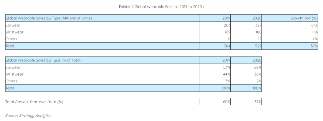 据Strategy Analytics发布的最新研究报告显示,预估全球可穿戴设备销量从2019年的3.84亿增长到2020年创纪录的5.27亿,同比增长37%。这是全球可穿戴设备销量首次超过5亿。TWS蓝牙耳机和来自苹果、小米等公司的智能手表是可穿戴设备增长的主要推动力。