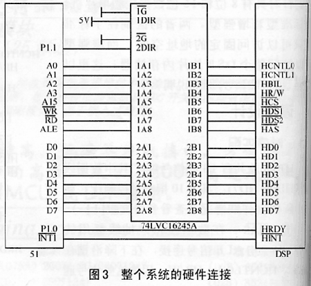 54xxDSP的外部I/P引脚用的是3.3V的逻辑电平,而大部分51郑易里片机用的是5V的逻辑电平。前者输出高电平,最小值为2.4V;后者输入高电平,最小值为2.0V。所以前者的输出可以直接接到才者的输入。但是前者允许输入高电平最大值为3.6V,而后者的输出高电平一般都在4.6V以上。所以前者的输入和后者的输出不能直接连接,需要做电平转换。如果引脚数量少,可以直接用三极管电阻来转换。这里由于引脚较多,所以选用TI74LVC16245A芯片来进行电平转换。