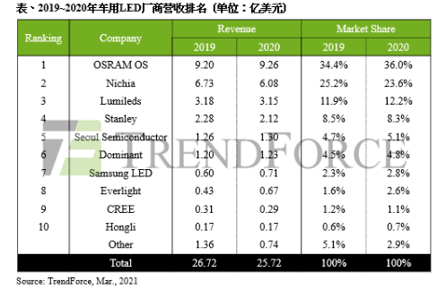 TrendForce集邦咨询分析师吴盈洁表示,2020年车用LED厂商营收排名中,由欧司朗光电半导体(OSRAM Opto Semiconductors)、日亚化学(Nichia)、Lumileds连续两年拿下全球前三大,三者市占率合计高达71.9%。其中,欧司朗光电半导体凭借其优异的产品质量,让欧美系高阶车款与新能源车皆视其为首选,成为推升其全球车用LED照明2020年营收成长的主要原因。