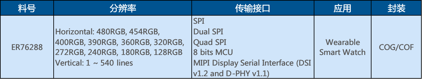 继去年TFT-LCD驱动芯片量产之后,禹创半导体再下一城,针对可穿戴设备应用的OLED驱动芯片ER76288已规模量产,该产品可支援圆形、方型、长条型、酒桶形等各种形状OLED屏幕,显示区可因应客户需求调整水滴型, 圆孔等设计,支持480RGB*480、454RGB*454等多种分辨率,同时,可分别针对R/G/B sub-pixel进行gamma校正,应不同液晶特性面板调整均匀度以呈现最佳视效,目前该产品已经与各大OLED穿戴面板厂对接验证中。