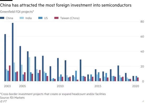 根据FT数据库fDi Markets的数据,自2015年以来,中国半导体行业已经宣布了约84个绿地投资(FDI)项目,其中44%为制造业项目。同期,美国吸引了45个外国半导体项目,其次是印度(37个),英国(36个)和中国台湾(29个)。