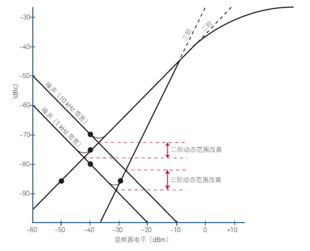 图 9. 显示的二阶和三阶动态范围是依 DANL 与对应失真曲线相交处的最小失真区域而定。