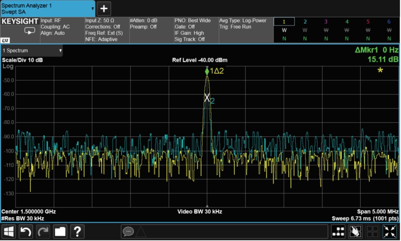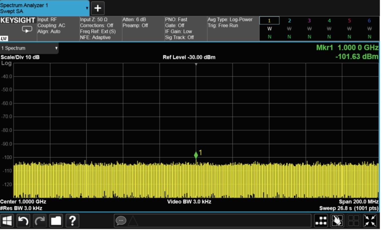在测量这个低电平信号时,可以综合使用多种方法,来提升分析仪的灵敏度:最小化输入衰减、缩小滤波器的分辨率带宽(RBW),以及使用前置放大器。与早期技术相似,这些技术可降低 DANL,将微小信号与噪声分离,从而实现精确测量。