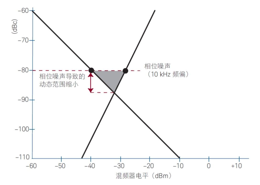 图 11. 对于像互调测试音调这样间距很小的信号,相位噪声可能会将测量动态范围限制为低于图表中所显示的值。