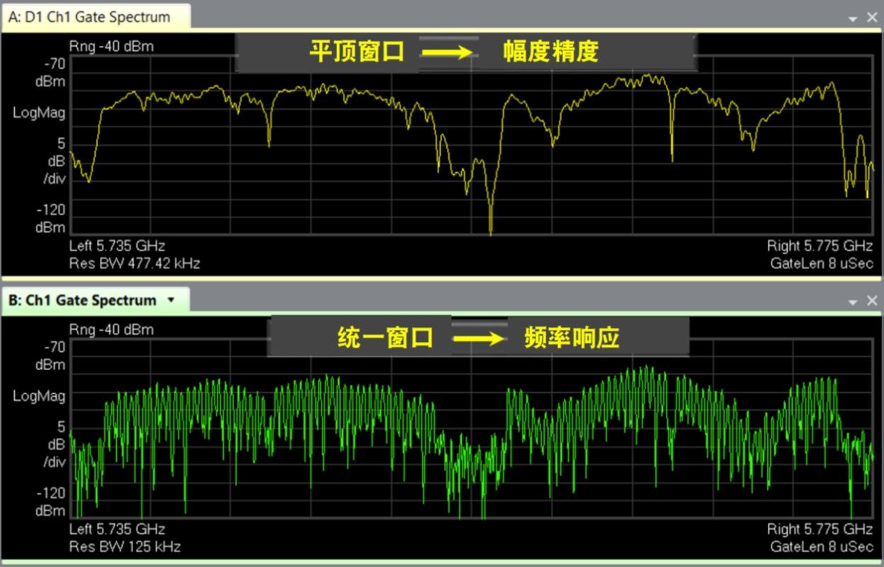 图 12 是测量两个 OFDM 训练序列符号时的平顶窗口与统一制式窗口的对比图;平顶窗口是专为幅度精度而设计的,它在频域显示下,顶部呈现平坦状态。在这种情况下,统一制式窗口提供了高精度的最佳频率分辨率。