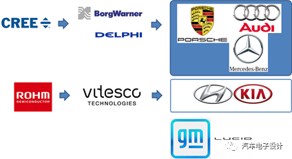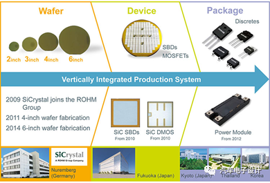 2020年年中Vitesco Technologies与罗姆签订了开发碳化硅电动汽车驱动器的协议。罗姆在碳化硅方面的投入时间也比较长,在2009年收购德国晶圆厂SiCrystal公司,主要做碳化硅柱、碳化硅衬底。2010年罗姆量产了碳化硅肖特基和碳化硅MOS,并在两年之后量产了碳化硅的模块。在碳化硅制作工艺上,罗姆从原材料开始,一直到最后的封装组装,罗姆的特点是通过自己一家公司全部完成。