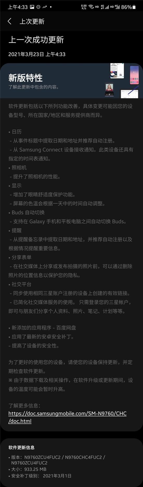 近期,三星 Note10、Note10 + 手机国行开始推送最新的 One UI 3.1 系统更新。带来了日历、提醒从中提取日期和地址并推荐自动注册。IT之家获悉,本次更新还提升了照相机的性能。支持在 Galaxy 手机和平板电脑之间自动切换 Buds。新添加了应用程序 - 百度网盘。