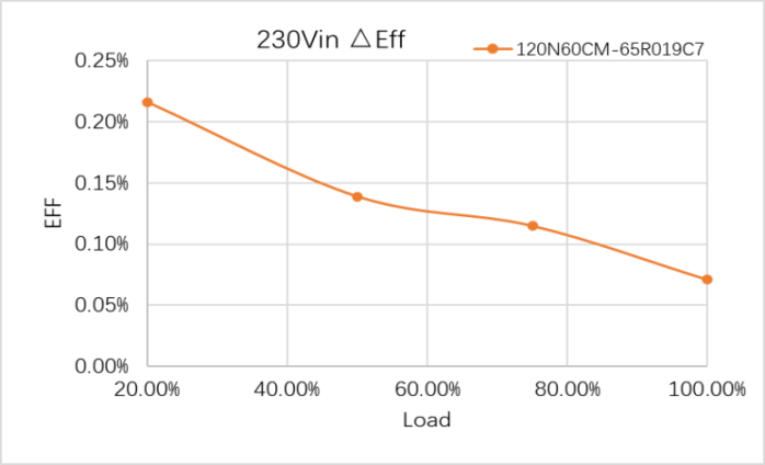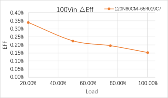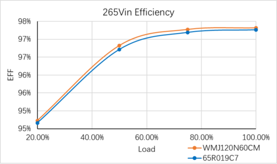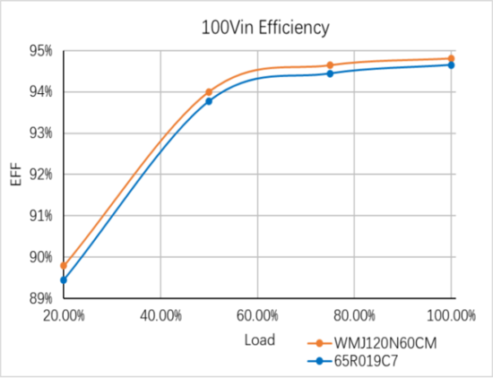 在3.3KW PFC模块电路测试中,WMJ120N60CM和行业某知名厂商的65R019C7效率几乎无差异,甚至比60R019C7高出0.15~0.34%; 对应的输入功耗小了1~4W。