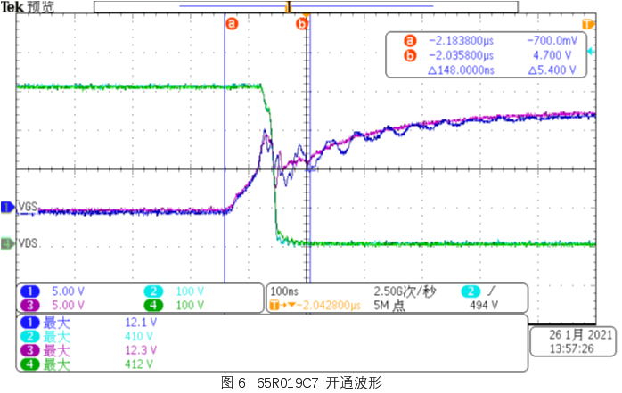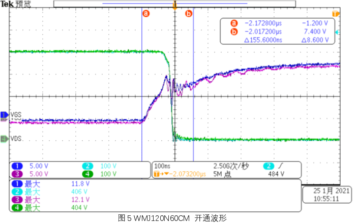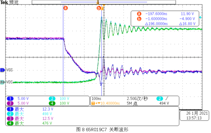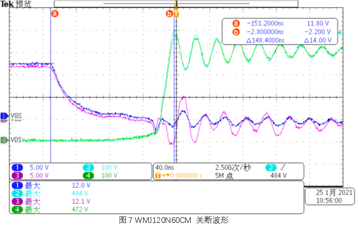 从VGS 关断波形来看, WMJ120N60CM 比65R019C7 略快。
