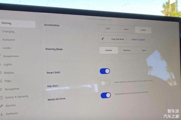 这次的新系统增加了Smart Shift功能,这或许是特斯拉的新功能,通过使用Autopilot/FSD系统检测实际车况,来自动控制驾驶模式,并自动操作换挡驾驶柄。不仅如此,还有一个新加入的Media On Drive功能,可以在驾驶时播放媒体。