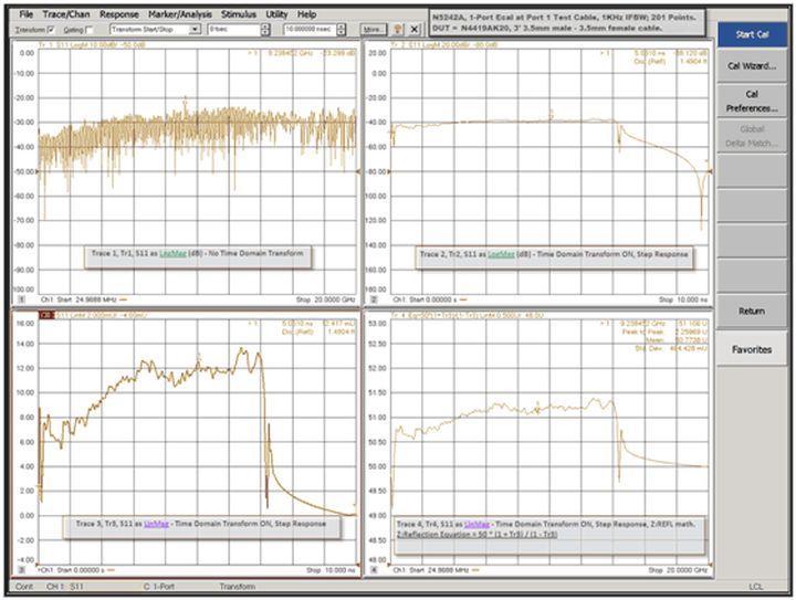 图 1 是具有 4 条 S11 迹线的 N5242B PNA-X单通道配置。这些迹线分别表示在 PNA 网络分析仪上获得时域转换后的信号(例如阻抗)的各个操作步骤。