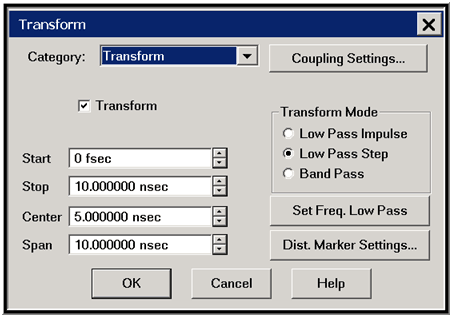 使用“Low Pass Step(低通步进)”时域转换模式。在“Low Pass Step”转换模式中,推测出低至直流的频率和负频率,因此分析仪将相应地改变起始频率。在用户之前校准使分析仪可以改变起始频率。要实现此目标,首先设置“Low Pass Step”转换模式,接着按下“Set Freq. Low Pass(设置低通频率)”按钮。“PNA Transform(PNA 转换)”窗口见图 2。