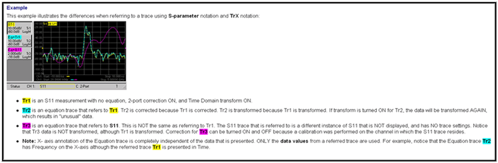 Z:REFL = Z0 * (1 + S11) / (1 – S11),其中 Z0 等于阻抗特征值(通常为 50Ω 或 75Ω)。然而,使用 PNA 上的方程编辑器将此方程应用于转换后的复数迹线数据(例如“Tr3”),校正过误差的 S11 参数不必像数学函数那样应用于转换后的数据。