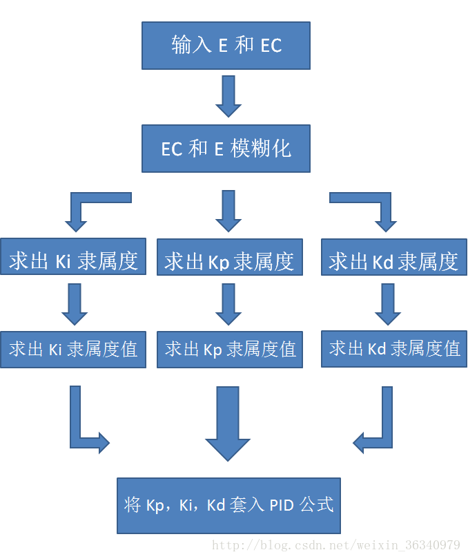 我们已经知道了整个模糊的过程,但上述的过程还不够完美。因为我们的输出值只有一个输出,并没有实现PID。因此我们可以先对E和EC进行模糊化,然后分别对kp和ki和kd(PID的三个参数)进行求解,再套入公式。