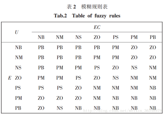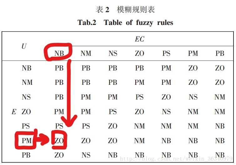 对于采集回来的E和EC,我们可以推出它们各所占的隶属度,此时我们可以根据模糊规则表去找出输出值所对应的隶属度。