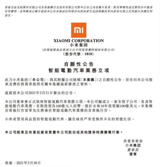 2021年03月30日 | 终于向汽车下手了!小米正式宣布开启智能汽车项目
