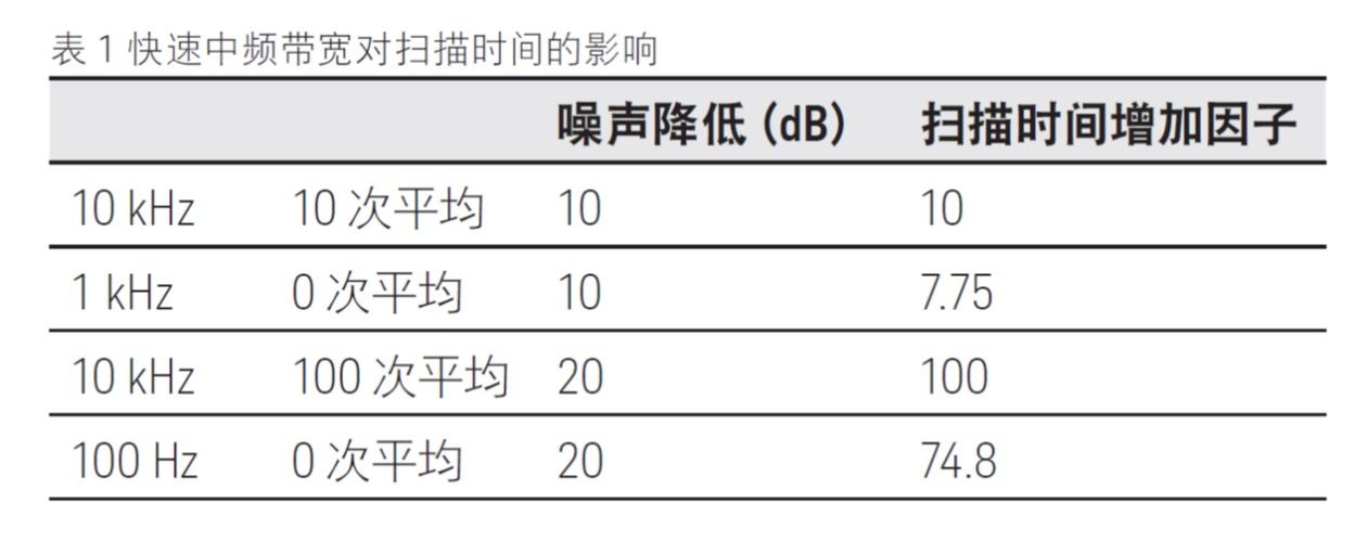以 10 kHz 中频带宽的 PNA 系列为例。如果在动态范围内需要改善 10 dB,则可以通过平均 10 次扫描或将中频带宽设置为 1 kHz 来实现。表 1 显示了为改善 10 或 20 dB 的动态范围而采用的两种方法对扫描时间的影响。