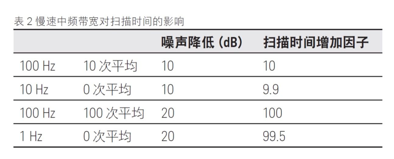 此示例采用了相当快的中频带宽,并且表明在尝试改善动态范围时,降低中频带宽比执行平均法更有优势。但是,现在考虑一下较慢的扫描模式(即较低的中频带宽)。如果 PNA 设置为 100 Hz 的中频带宽并且需要降低 10 dB 的本底噪声,则可以应用 10 次平均,或将中频带宽降低到 10 Hz。表 2 显示了对扫描时间的影响。