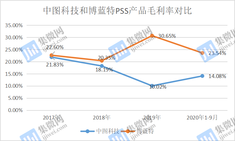 相对而言,同样以PSS业务为主的博蓝特的毛利率明显高于中图科技,在上述时间内,博蓝特的毛利率分别为22.60%、20.35%、30.65%、23.54%,均高于中图科技,尤其是2019年更是远远高于中图科技。