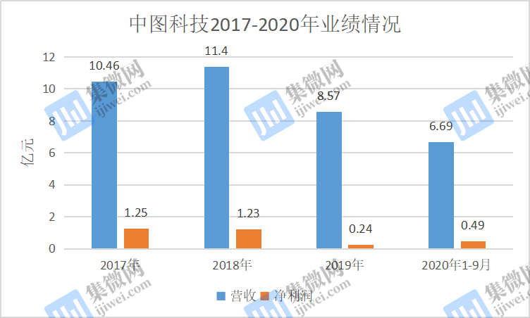 2017年至2020年1-9月,中图科技营业收入分别为10.46亿元、11.4亿元、8.57亿元和6.69亿元,净利润分别为1.25亿元、1.23亿元、0.24亿元和0.49亿元,其营收及净利润均呈现出波动下滑趋势。