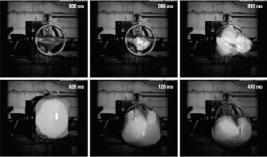 以安全气囊测量为例:仅在视觉信息上方,在计算所得3D热图像序列示例图下方,安全气囊以高达50米/秒的速度展开,耗时仅20毫秒