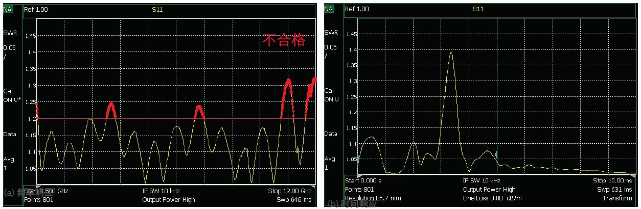 通信或雷达系统由器件和系统构成,要对这些器件和系统的功能进行测试并确定其是否合格,常常要求这些器件的电子性能要达到其工作频率范围内的某一规定性能。这些技术指标包括电压驻波比(VSWR)、回波损耗和插入损耗等。当被测器件(DUP)达到或未达到其作为频率函数的性能要求时,这些技术指标将提供一个明确区分。图 1a 所示为某个系统上的测得的 VSWR,在 8.5 至 12 GHz 的测得频率范围内, VSWR 在多个地方超出了技术指标。本例中使用的 Keysight FieldFox 矢量网络分析仪(VNA)使用了限制线配置,以帮助操作人员快速确定被测器件是通过还是未通过测试。