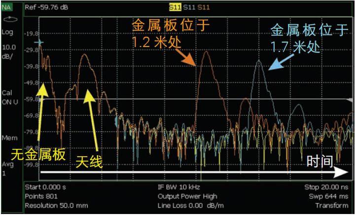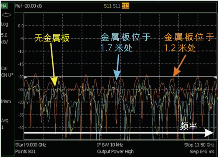 图 4 所示为该系统在三种测试条件下的频率响应;其中两种的金属板靠近天线,另一种不使用金属板。黄色迹线显示的是不使用金属板的测量。由于各种传输线间的交互作用以及周围环境中各项目的反射, 测量的 S11 响应有小的纹波。蓝色迹线显示的是金属板距喇叭天线 1.7 米时的频率响应。在这种情况下,S11 与不使用金属板时相比有更大的纹波。橙色迹线显示的是金属板再靠近一些、间距为 1.2 米时的结果。此时,纹波更加明显,因为来自金属板的反射信号有更大的接收幅度。