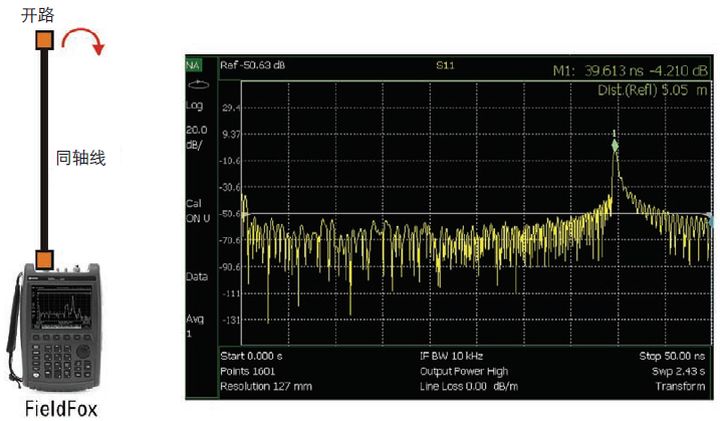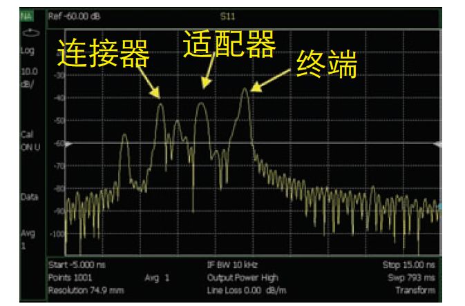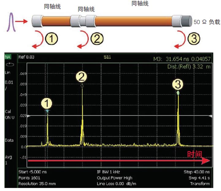 图 2. 时域响应的配置和测量显示沿同轴传输线有三个断点
