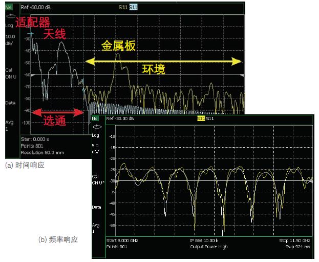图 10. 测得的频域响应 S11 (10a) 和 (10b) 测得的时域响应显示了来自输入连接器、滤波器和开路端电缆的反射特征