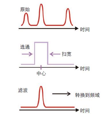 选通的基本概念是引入时间滤波器,移除时域响应的多余反射。这个时间滤波器的工作方式与频率滤波器在频域中的工作方式相同。一旦从时域中移除多余响应,便可观察到剩余器件的频域响应。图 6 是一个拥有三个峰值的理想时域响应的简单示例。在此例中,时间滤波器或“选通”配置为要移除其中的两个峰值。通过调整选通的时间中心和扫宽,可在时域中创建一个等效的带通滤波器。一旦选通激活,便可在时域和频域的测量中移除高峰值和低峰值与带通选通一起,FieldFox VNA 还有另一种类型的选通能够传输一个峰值,或者对峰值进行分组,使剩下的峰值高于或低于滤波器响应。在任何一种情况下,一旦选通在时域中进行正确配置,用户便可将 VNA 返回频域以检查系统的频率响应及滤波后峰值的影响。