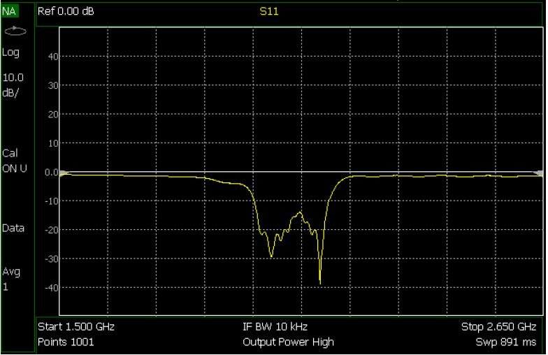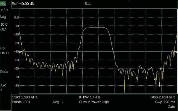 需要注意,在图 11b 中,选通频率响应的边沿拥有增加的幅度。这种增加并非在线带通滤波器的功能,而是涉及选通功能的信号处理的假象。 通过调整 FieldFox VNA 前面板的选通功能的特征,可能降低频域中的边沿效应。有关优化选通窗口的详细介绍请参见“FieldFox 用户指南”和“是德科技时域应用指南”1287-12 [1]。