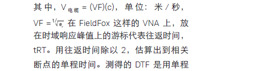 时间乘以信号在介质中的速度 vcable。速度单位采用米 / 秒,也可使用英尺 / 秒来计算。我们已经知道信号在真空中的速度等于光速 c。信号在介质中的速度等于光速 c 乘以小于或等于 1 的速度系数(VF)。VF 为传输线介电常数 er 的平方根的倒数。例如,同轴电缆使用固体PTFE 作为电介质,则 VF 为 0.7,因为PTFE 的介电常数为 2.1。当使用 VNA 来测量故障位置时,向 VNA 中精确输入速度系数很重要。 当使用 FieldFox VNA 来测量 DTF 时,只要正确输入VF,FieldFox 游标便能同时正确显示时间和到断点的经过校正的单向距离。另外,使用配置为 CAT 模式的 FieldFox 时,所有时域显示参数都可自动转换为距离。是德科技应用指南 [6] 针对未知电缆的速度系数估计提供了更多信息。