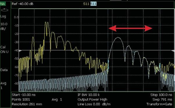 需要注意的是,当沿传输线的断点反射能量时,这一部分的能量不能到达沿线路的后续断点。这种效应可能隐藏或“掩蔽” 后面断点的真实响应。当传输路径在沿线长度上存在插入损耗时可能出现这种情况。选通功能不能对这种掩蔽效应进行补偿,掩模将在下一节进行探讨。