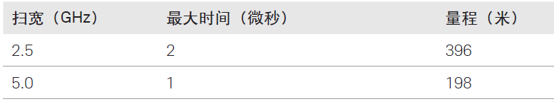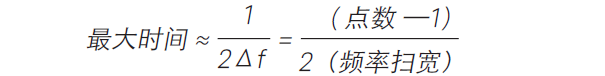 虽然较大的频率扫宽能够提高时域分辨率,但它同时也会对可测量的总时间扫宽或最大量程产生不利影响。下一节将讨论频率扫宽与最大可测量时间之间的关系。