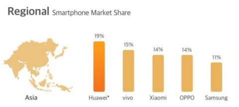 在亚洲,华为手机依然在2020年总体出货市场份额排第一,如下图: