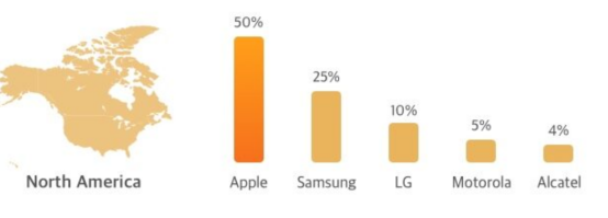 在北美,苹果出货市场份额高达50%,如下图: