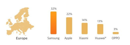 在欧洲,出货市场份额排第一的则是三星,为32%: