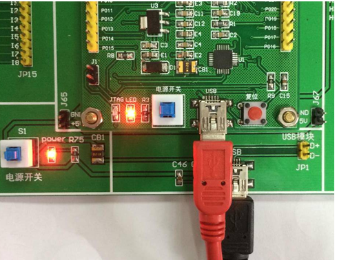 2)将USB线MINI小口一端插到ARM7核心板USB接口,另外扁口A端连接电脑USB接口。