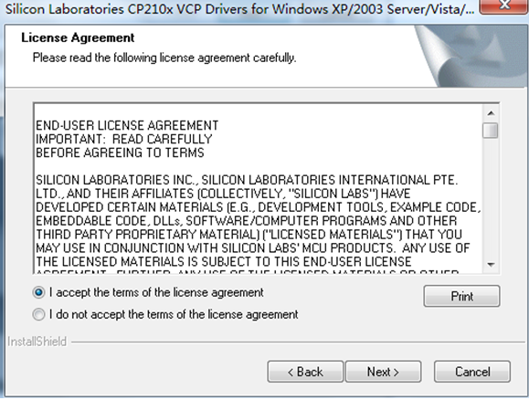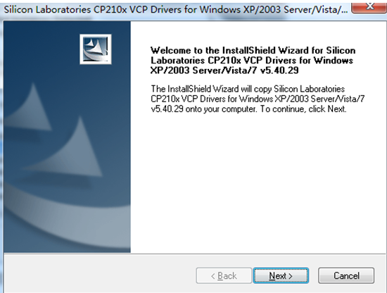 打开光盘中的驱动程序CP210x_VCP_Win_XP_S2K3_Vista_7.exe