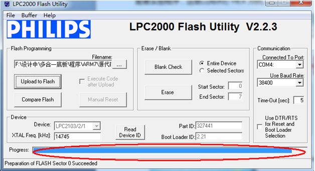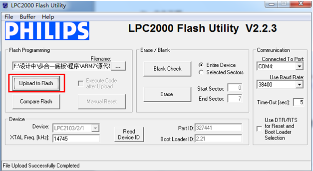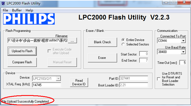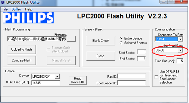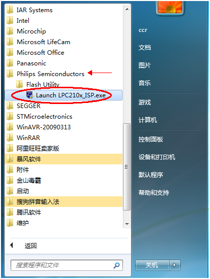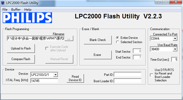 安装好下载软件后,我们来打开软件,在开始菜单-所有程序-Philips Semiconductors-Flash Utility文件夹下,可以看到下载软件Lauch LPC210X_ISP.exe