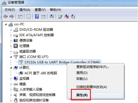 右击CP2102驱动设备,选择属性,